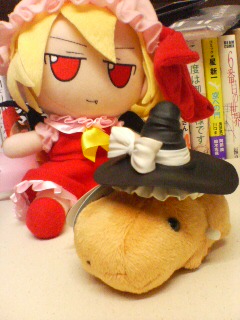 魔理沙フィギュアの帽子を、とてとてカピバラさん(ゼンマイ付き)に被せてみた。